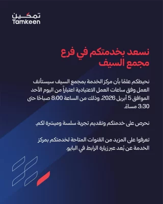 تسعدنا خدمتكم في مركز الخدمة بمجمع السيف اعتبارًا من اليوم الأحد الموافق 5 أبريل 2026، وذلك من الساعة 8:00 صباحًا حتى 3:30 مساءً